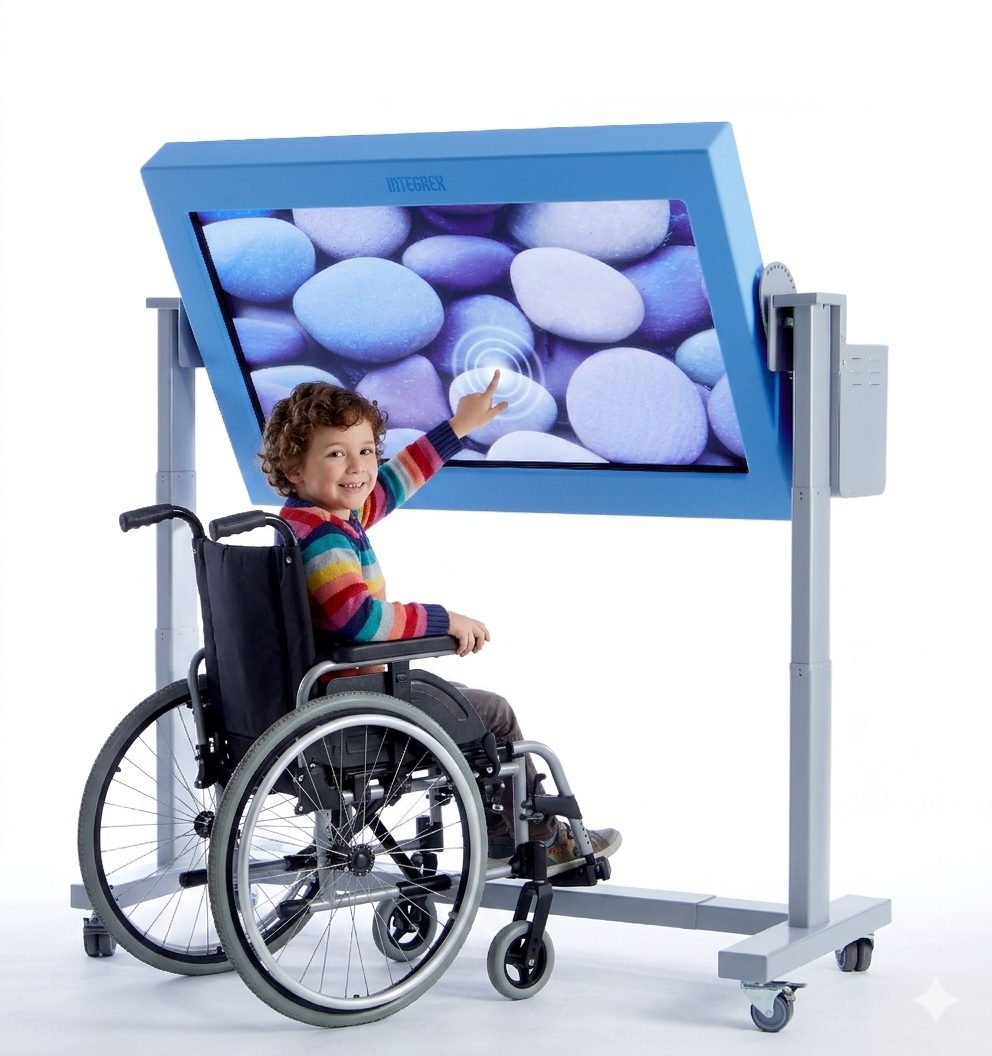 Unleash limitless potential with the Visilift Plus. This ultimate portable, electronically height-adjustable interactive touchscreen is designed for special education and users of all ages and abilities, including those in wheelchairs, standing frames, or prone positions. In addition, ordinary interactive touchscreens are not practical in these cases. Furthermore, the Visilift Plus serves as both a versatile sensory screen and an interactive screen for special education. It adapts seamlessly to meet diverse needs, thus ensuring optimal usability in a variety of settings.
